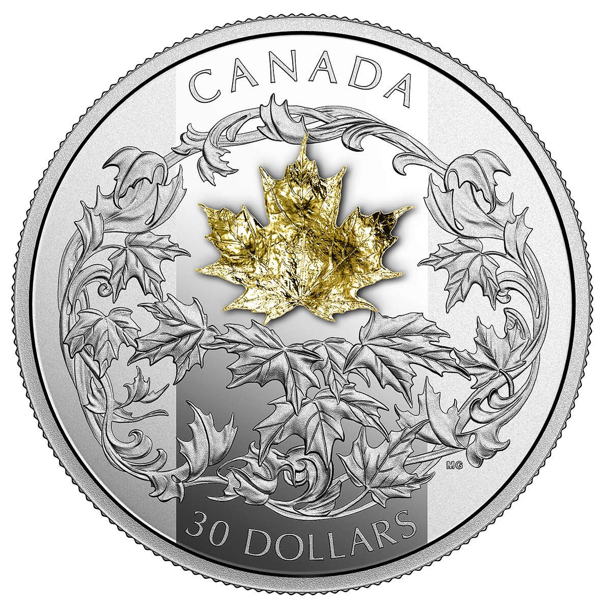 2018 $30 Falling 3D Gold Maple Leaf – Pure Silver + 18K Gold