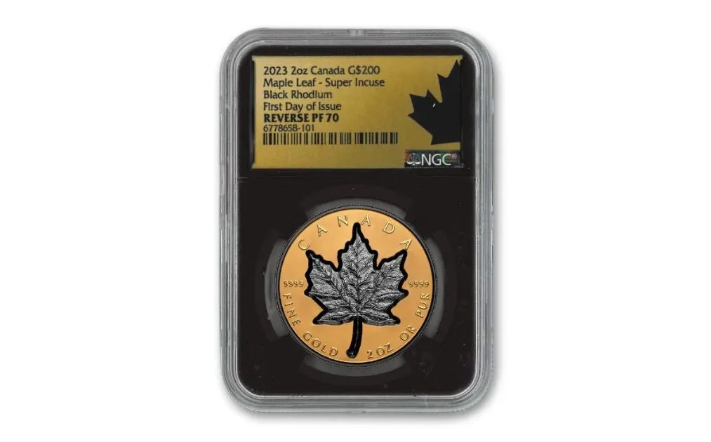 - PERFECT PROOF CONDITION –Your 2023 Canada $200 Two-Ounce Gold Super Incuse Black Rhodium Maple Leaf Reverse Proof has been graded by the Numismatic Guaranty Company (NGC) in perfect Proof-70 (PF70) condition.