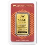 The obverse of the bar showcases the Asahi Refining logo, along with inscriptions denoting the bar’s weight, purity, and metal content: “1 OUNCE TROY,” “FINE GOLD,” and “9999.” These markings affirm the bar’s authenticity and quality.