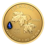 A fitting anniversary tribute, the 1 oz. coin features a 0.35 carat genuine AAA royal blue sapphire shaped like a water droplet. It gracefully falls from the sugar maple leaf that provided the foundation for this unforgettable design.